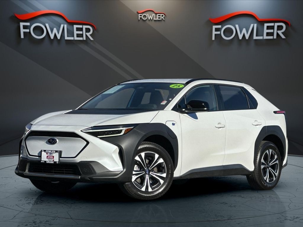 Certified. Cosmic White Pearl 2025 Subaru Solterra Premium AWD 1-Speed Automatic Electric Motor Subaru Certified Pre-Owned Certified, 4-Wheel Disc Brakes, 6 Speakers, ABS brakes, Air Conditioning, Alloy wheels, AM/FM radio: SiriusXM, Auto High-beam Headlights, Auto-dimming Rear-View mirror, Automatic temperature control, Brake assist, Bumpers: body-color, Cloth Upholstery, Driver door bin, Driver vanity mirror, Dual front impact airbags, Dual front side impact airbags, Electronic Stability Control, Emergency communication system: Subaru Solterra Connect - Safety Connect (1 year trial included), Exterior Parking Camera Rear, Four wheel independent suspension, Front anti-roll bar, Front Bucket Seats, Front Center Armrest, Front dual zone A/C, Front reading lights, Fully automatic headlights, Heated door mirrors, Heated Front Bucket Seats, Heated front seats, Illuminated entry, Knee airbag, Leather steering wheel, Low tire pressure warning, Occupant sensing airbag, Outside temperature display, Overhead airbag, Overhead console, Panic alarm, Passenger door bin, Passenger vanity mirror, Power door mirrors, Power steering, Power windows, Radio data system, Radio: Subaru 8.0" Multimedia System, Rear anti-roll bar, Rear reading lights, Rear seat center armrest, Rear window defroster, Remote keyless entry, Security system, Speed control, Speed-sensing steering, Split folding rear seat, Spoiler, Steering wheel mounted audio controls, Telescoping steering wheel, Tilt steering wheel, Traction control, Trip computer, Variably intermittent wipers, Wheels: 18" x 7.5" J Aluminum-Alloy.