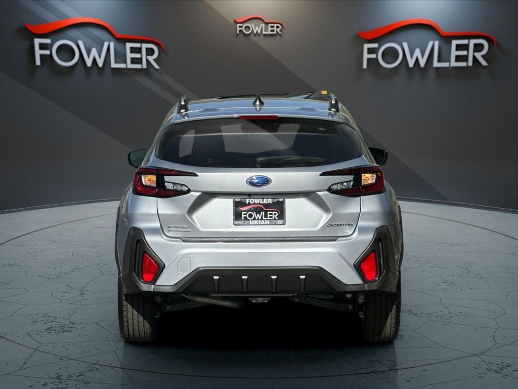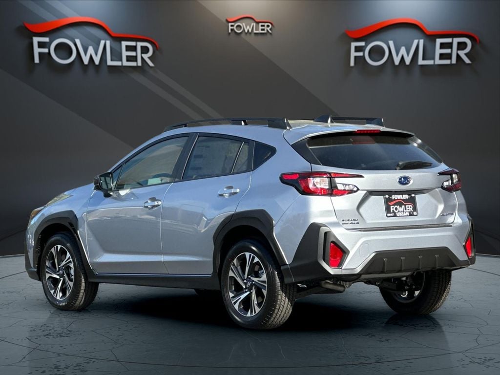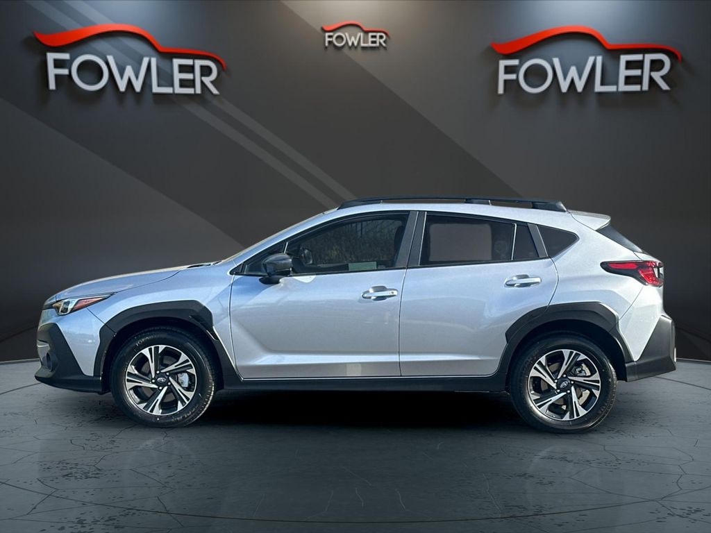 Ice Silver Metallic 2025 Subaru Crosstrek Premium AWD Lineartronic CVT 2.5L 4-Cylinder DOHC 16V 4-Wheel Disc Brakes, 6 Speakers, ABS brakes, Air Conditioning, Alloy wheels, AM/FM radio: SiriusXM, Anti-whiplash front head restraints, Auto High-beam Headlights, Automatic temperature control, Brake assist, Bumpers: body-color, Cloth Upholstery, Driver door bin, Driver vanity mirror, Dual front impact airbags, Dual front side impact airbags, Electronic Stability Control, Emergency communication system, Exterior Parking Camera Rear, Four wheel independent suspension, Front anti-roll bar, Front Bucket Seats, Front Center Armrest, Front dual zone A/C, Front fog lights, Front reading lights, Fully automatic headlights, Illuminated entry, Knee airbag, Low tire pressure warning, Occupant sensing airbag, Outside temperature display, Overhead airbag, Overhead console, Panic alarm, Passenger door bin, Passenger vanity mirror, Power door mirrors, Power steering, Power windows, Radio data system, Radio: Subaru 11.6" Multimedia Plus System, Rear anti-roll bar, Rear seat center armrest, Rear window defroster, Rear window wiper, Remote keyless entry, Security system, Speed control, Speed-sensing steering, Split folding rear seat, Spoiler, Steering wheel mounted audio controls, Tachometer, Telescoping steering wheel, Tilt steering wheel, Traction control, Trip computer, Turn signal indicator mirrors, Variably intermittent wipers, Wheels: 17" x 7.0" J Machine Finish Aluminum-Alloy.
