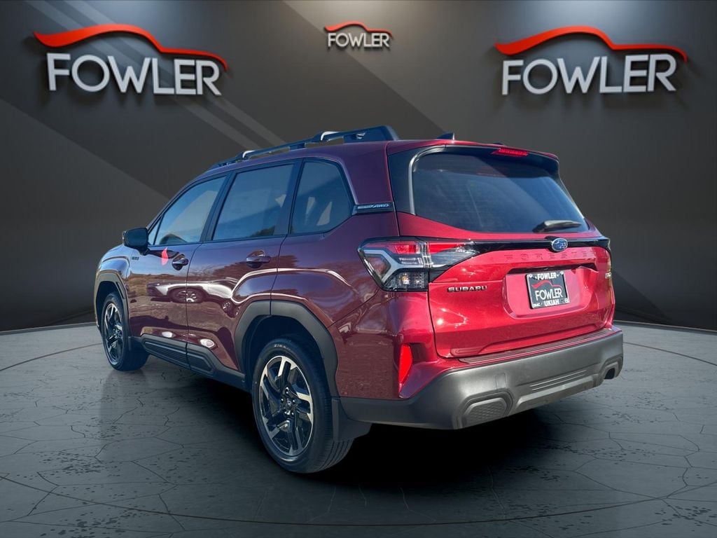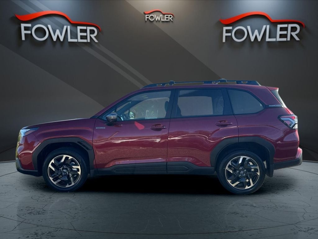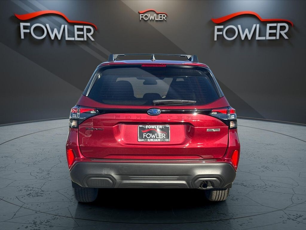 Crimson Red Pearl 2025 Subaru Forester Hybrid Premium AWD Lineartronic CVT 2.5L 4-Cylinder DOHC 16V 2.5L 4-Cylinder DOHC 16V, 4-Wheel Disc Brakes, 6 Speakers, ABS brakes, Air Conditioning, Alloy wheels, AM/FM radio: SiriusXM with 360L, Anti-whiplash front head restraints, Auto High-beam Headlights, Automatic temperature control, Brake assist, Bumpers: body-color, Compass, Crossbar Set - Aero, Driver door bin, Driver vanity mirror, Dual front impact airbags, Dual front side impact airbags, Electronic Stability Control, Emergency communication system: MySubaru Safety (3-year free trial), Exterior Parking Camera Rear, Four wheel independent suspension, Front anti-roll bar, Front Bucket Seats, Front Center Armrest, Front dual zone A/C, Front fog lights, Front reading lights, Fully automatic headlights, Heated door mirrors, Heated Front Bucket Seats, Heated front seats, Illuminated entry, Knee airbag, LED Upgrade, Low tire pressure warning, Navigation system: TomTom Navigation w/what3words, Occupant sensing airbag, Outside temperature display, Overhead airbag, Overhead console, Panic alarm, Passenger door bin, Passenger vanity mirror, Power door mirrors, Power driver seat, Power Liftgate, Power moonroof: Panoramic, Power steering, Power windows, Premium Cloth Upholstery, Radio data system, Radio: Subaru 11.6" Multimedia Navigation System, Rear anti-roll bar, Rear Bumper Cover, Rear seat center armrest, Rear window defroster, Rear window wiper, Remote keyless entry, Security system, Speed control, Speed-sensing steering, Splash Guards, Split folding rear seat, Spoiler, Standard Model, Steering wheel mounted audio controls, Sunshade - Windshield, Tachometer, Telescoping steering wheel, Tilt steering wheel, Traction control, Trip computer, Variably intermittent wipers, Wheels: 18" x 7.0 J Dark Metallic Aluminum-Alloy, 2.5L 4-Cylinder DOHC 16V.