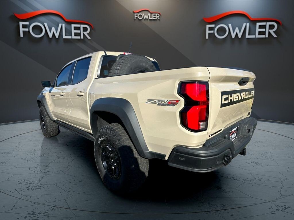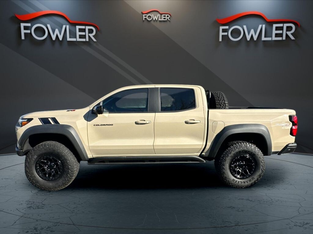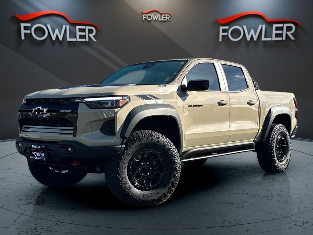 Sand Dune Metallic 2024 Chevrolet Colorado ZR2 4WD 8-Speed Automatic 2.7L I4 Turbocharged DOHC 16V LEV3-ULEV50 310hp 4WD, 1st & 2nd Row All-Weather Floor Liner (LPO), 3.42 Rear Axle Ratio, 4-Way Manual Passenger Seat Adjuster, 4-Wheel Disc Brakes, 6 Speakers, 6-Speaker Audio System Feature, 8-Way Power Driver Seat Adjuster, ABS brakes, Adaptive Cruise Control, AEV Heavy Duty Stamped-Steel Front Bumper, AEV Heavy Duty Stamped-Steel Rear Bumper, AEV Wheel Flares, Air Conditioning, Alloy wheels, AM/FM radio: SiriusXM, Apple CarPlay/Android Auto, Auto High-beam Headlights, Auto-dimming Rear-View mirror, Automatic Emergency Braking, Automatic temperature control, Blind Zone Steering Assist w/Trailering, Brake assist, Chevy Safety Assist, Cloth/Evotex Seat Trim, Compass, Delay-off headlights, Driver & Front Passenger Ventilated Seats, Driver door bin, Driver Memory Settings, Driver Seatback Map Pocket, Driver vanity mirror, Dual front impact airbags, Dual front side impact airbags, Electronic Automatic Cruise Control, Electronic Stability Control, Following Distance Indicator, Forward Collision Alert, Front anti-roll bar, Front Bucket Seats, Front Center Armrest, Front dual zone A/C, Front fog lights, Front Passenger Seatback Map Pocket, Front Pedestrian & Bicyclist Braking, Front reading lights, Front wheel independent suspension, HD Surround Vision, Heated door mirrors, Heated Driver & Front Passenger Seats, Heated front seats, Heated Steering Wheel, Illuminated entry, IntelliBeam Automatic High Beam On/Off, Lane Keep Assist w/Lane Departure Warning, Low tire pressure warning, Multimatic Jounce Control Dampers, Navigation System, Occupant sensing airbag, Outside temperature display, Overhead airbag, Overhead console, Panic alarm, Passenger door bin, Passenger vanity mirror, Perforated Leather-Appointed Seat Trim, Power door mirrors, Power Driver Lumbar Control Seat Adjuster, Power driver seat, Power steering, Power windows, Preferred Equipment Group 4ZR, Radio data system, Radio: 11.3" Diagonal Advanced Color LCD Display, Rear Center Armrest, Rear Cross Traffic Braking, Rear Park Assist, Rear Pedestrian Alert, Rear reading lights, Rear step bumper, Rear window defroster, Rear-Window Electric Defogger, Remote keyless entry, Safety Package, Security system, SiriusXM Radio, Speed control, Speed-sensing steering, Split folding rear seat, Steering Wheel Mounted Audio Controls, Steering wheel mounted audio controls, Tachometer, Technology Package, Telescoping steering wheel, Tilt steering wheel, Traction control, Trip computer, Variably intermittent wipers, Wheels: 17" Beadlock Capable Carbon Flash Metallic, Wheels: 17" x 8" Graphite & Oxide Gold Aluminum, Wireless Charging, Wireless Phone Projection, ZR2 Bison Edition, ZR2 Convenience Package III, ZR2 Off-Road Package, 4WD.