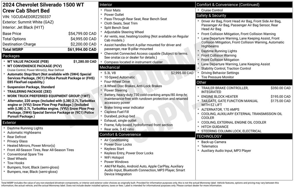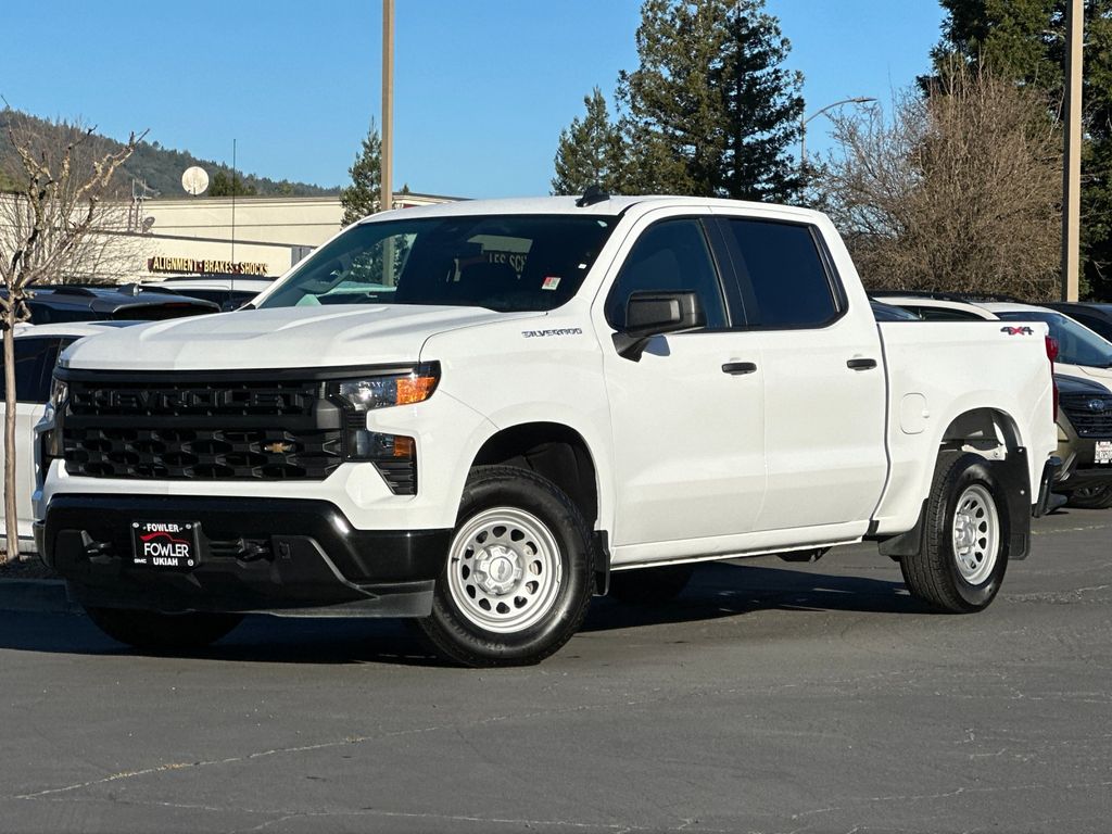 White 2024 Chevrolet Silverado 1500 WT 4WD 10-Speed Automatic EcoTec3 5.3L V8 10-Speed Automatic, 4WD, Vinyl, 220 Amp Alternator, 3.42 Rear Axle Ratio, 3.5" Monochromatic Display Driver Info Center, 4-Wheel Disc Brakes, 40/20/40 Front Split-Bench Seat, 6 Speakers, 6-Speaker Audio System, ABS brakes, Air Conditioning, Auto High-beam Headlights, Automatic Emergency Braking, Black (Semi-Gloss) Front Bumper, Black (Semi-Gloss) Rear Bumper, Black Manual Outside Mirrors, Bluetooth® For Phone, Brake assist, Chevrolet Connected Access Capable, Compass, Delay-off headlights, Driver door bin, Dual front impact airbags, Dual front side impact airbags, Electrical Steering Column Lock, Electronic Stability Control, Following Distance Indicator, Forward Collision Alert, Front anti-roll bar, Front Center Armrest w/Storage, Front Frame-Mounted Black Recovery Hooks, Front Pedestrian Braking, Front reading lights, Front wheel independent suspension, Fully automatic headlights, HD Rear Vision Camera, Illuminated entry, Inside Rear-View Mirror w/Tilt, IntelliBeam Automatic High Beam On/Off, Lane Keep Assist w/Lane Departure Warning, Locking Tailgate, Low tire pressure warning, Manual Tailgate Function w/No EZ Lift, Manual Tilt Wheel Steering Column, Occupant sensing airbag, OnStar & Chevrolet Connected Services Capable, Outside temperature display, Overhead airbag, Overhead console, Panic alarm, Passenger door bin, Passenger vanity mirror, Power Front Windows w/Driver Express Up/Down, Power Front Windows w/Passenger Express Down, Power Rear Windows w/Express Down, Power steering, Power windows, Premium audio system: Chevrolet Infotainment 3, Radio data system, Radio: Chevrolet Infotainment 3 System, Rear 60/40 Folding Bench Seat (Folds Up), Rear reading lights, Rear step bumper, Remote Keyless Entry, Remote keyless entry, Rubberized-Vinyl Floor Covering, SiriusXM Delete, Solar Absorbing Tinted Glass, Speed-sensing steering, Split folding rear seat, Standard Suspension Package, Standard Tailgate, Tachometer, Tilt steering wheel, Traction control, Trip computer, Variably intermittent wipers, Vinyl Seat Trim, Voltmeter, Wheels: 17" x 8" Ultra Silver Painted Steel, Wi-Fi Hot Spot Capable, 10-Speed Automatic, 4WD, Vinyl.