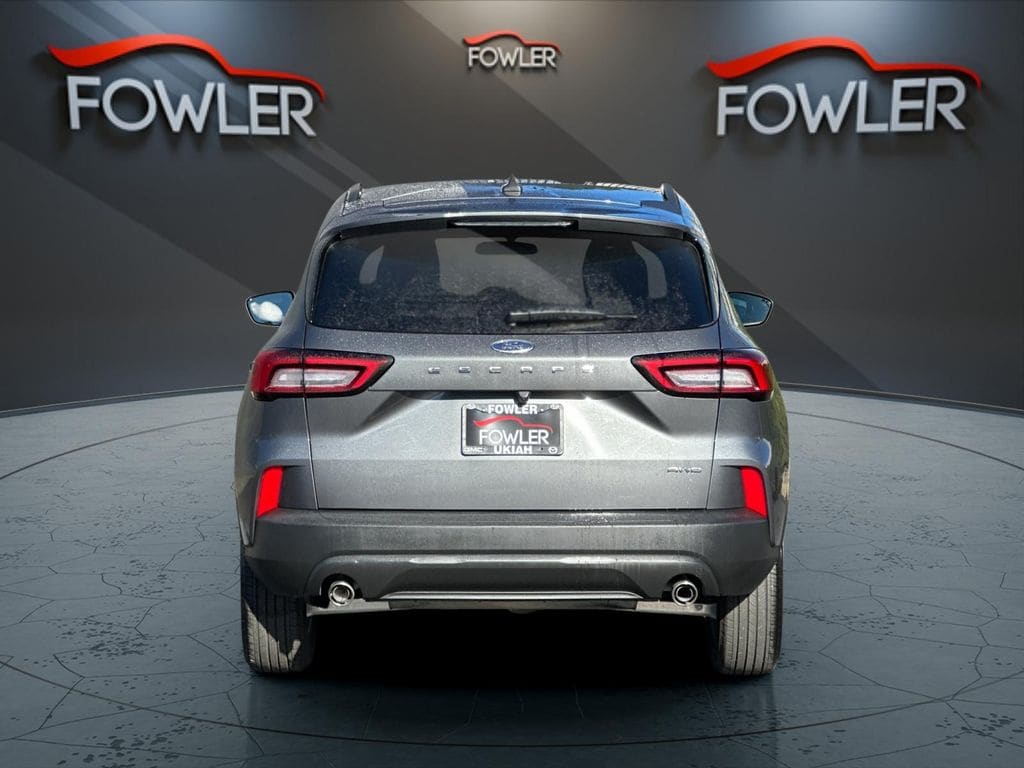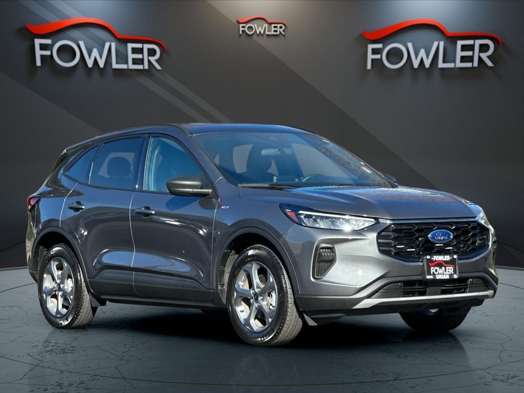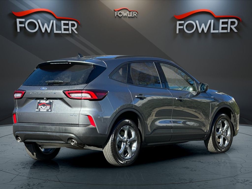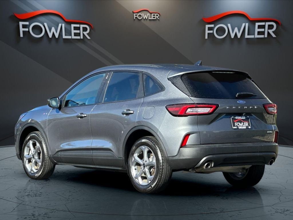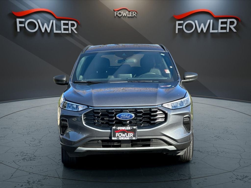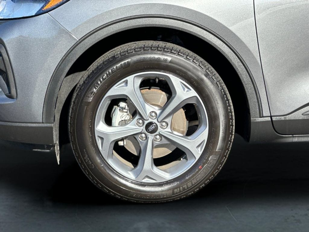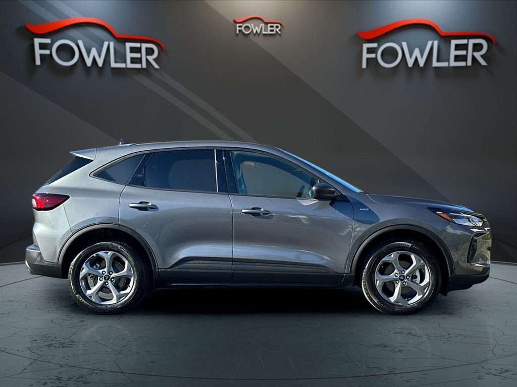 Gray Metallic 2025 Ford Escape ST-Line AWD 8-Speed Automatic 1.5L EcoBoost AWD, 3.81 Axle Ratio, 4-Wheel Disc Brakes, 6 Speakers, ABS brakes, Air Conditioning, Alloy wheels, AM/FM radio: SiriusXM, AM/FM Stereo, Auto High-beam Headlights, Automatic temperature control, Brake assist, Bumpers: body-color, Compass, Delay-off headlights, Driver door bin, Driver vanity mirror, Dual front impact airbags, Dual front side impact airbags, Electronic Stability Control, Emergency communication system: SYNC 4 911 Assist, Equipment Group 300A, FordPass Connect, Four wheel independent suspension, Front anti-roll bar, Front Bucket Seats, Front Center Armrest, Front dual zone A/C, Front License Plate Bracket, Front reading lights, Fully automatic headlights, Illuminated entry, Internet access capable: FordPass Connect 4G, Knee airbag, Low tire pressure warning, Occupant sensing airbag, Outside temperature display, Overhead airbag, Overhead console, Panic alarm, Passenger door bin, Passenger vanity mirror, Power door mirrors, Power driver seat, Power steering, Power windows, Radio data system, Rear anti-roll bar, Rear reading lights, Rear seat center armrest, Rear window defroster, Rear window wiper, Remote keyless entry, Speed control, Speed-sensing steering, Speed-Sensitive Wipers, Split folding rear seat, Spoiler, Sport steering wheel, Steering wheel mounted audio controls, SYNC 4, Tachometer, Telescoping steering wheel, Tilt steering wheel, Traction control, Trip computer, Variably intermittent wipers, Vinyl/Cloth Front Sport Contour Bucket Seats, Wheels: 18" Rock Metallic Painted Aluminum, AWD.