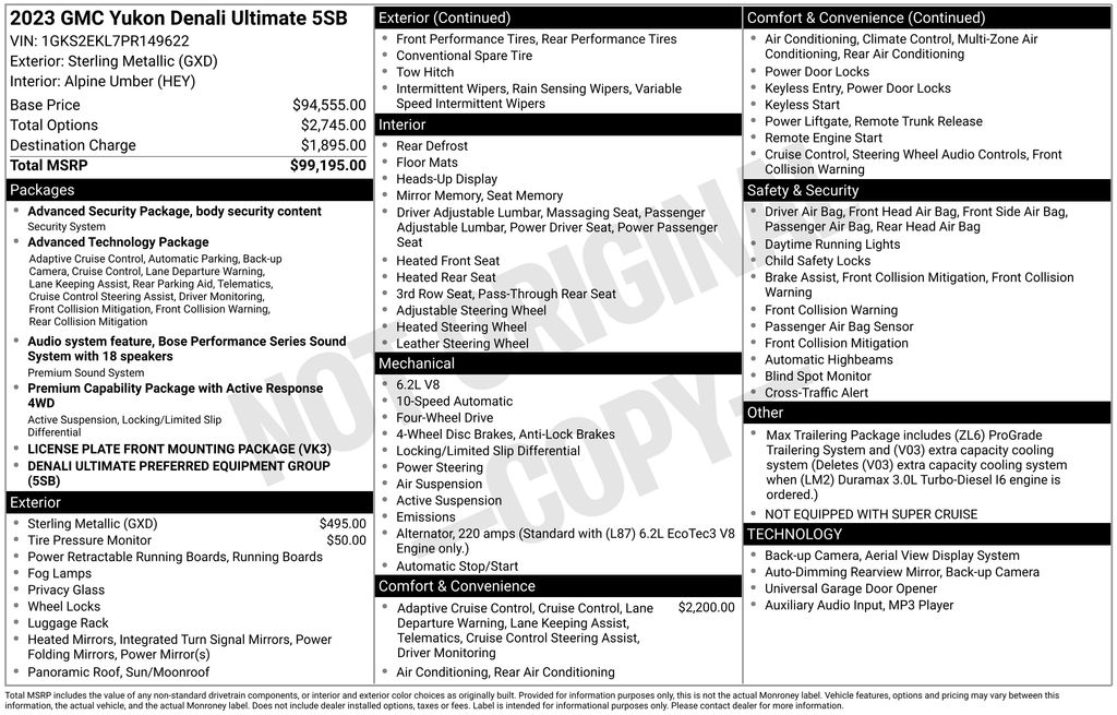 Sterling Metallic 2023 GMC Yukon Denali Ultimate 4WD 10-Speed Automatic with Overdrive EcoTec3 6.2L V8 4WD, 15" Diagonal Multi-Color Head-Up Display, 16-Way Power Seat Adjusters, 18 Speakers, 2 Presets For Outside Rearview Mirrors, 3 Years of GMC Connected Services, 3 Years of OnStar Safety & Security, 3 Years of OnStar Safety & Security (DISC), 3.23 Rear Axle Ratio, 3rd Row 60/40 Power-Folding Split-Bench Seat, 3rd row seats: split-bench, 4-Wheel Disc Brakes, ABS brakes, Adaptive Cruise Control, Adaptive suspension, Advanced Security Package, Advanced Technology Package, Air Conditioning, Air Ride Adaptive Suspension, Alloy wheels, AM/FM radio: SiriusXM with 360L, AM/FM Stereo, Apple CarPlay/Android Auto, Auto High-beam Headlights, Auto-dimming door mirrors, Auto-dimming Rear-View mirror, Auto-leveling suspension, Automatic temperature control, Bodyside moldings, Bose Performance Series Sound System w/18 Speakers, Brake assist, Bright Front & Rear Door Sill Plates, Bumpers: body-color, Chrome Door Handles w/Body-Color Strip, Compass, Delay-off headlights, Driver door bin, Driver vanity mirror, Dual Exhaust System, Dual front impact airbags, Dual front side impact airbags, Dual-Pane Panoramic Power Sunroof, Electronic Limited Slip Differential (eLSD), Electronic Stability Control, Emergency communication system: OnStar and GMC connected services capable, Enhanced Automatic Emergency Braking, Enhanced Automatic Parking Assist, Extra Capacity Cooling System, Floor Console, Four wheel independent suspension, Front anti-roll bar, Front Bucket Seats, Front Center Armrest, Front dual zone A/C, Front fog lights, Front reading lights, Full Grain Leather Seats, Fully automatic headlights, Garage door transmitter, Glass Breakage Sensor, Hands-Free Power Programmable Rear Liftgate, HD Surround Vision, Headphones, Heads-Up Display, Heated & Ventilated Driver & Front Passenger Seats, Heated 2nd Row Outboard Position Seats, Heated door mirrors, Heated Driver & Front Passenger Seats, Heated front seats, Heated rear seats, Heated Steering Wheel, Heated steering wheel, Hill Descent Control, Hitch Guidance w/Hitch View, Illuminated entry, Inside Rearview Auto-Dimming Rear Camera Mirror, Integrated Trailer Brake Controller, Lane Departure Warning System, Lane Keep Assist w/Lane Departure Warning, Leather steering wheel, Leather-Wrapped Steering Wheel, License Plate Front Mounting Package, Low tire pressure warning, Magnetic Ride Control Suspension, Max Trailering Package, Memory seat, Navigation System, Not Equipped w/Super Cruise, Not Equipped w/Super Cruise (02O), Occupant sensing airbag, Outside Heated Power-Adjustable Mirrors, Outside temperature display, Overhead airbag, Overhead console, Panic alarm, Passenger door bin, Passenger vanity mirror, Power door mirrors, Power driver seat, Power Liftgate, Power moonroof, Power passenger seat, Power Release 2nd Row Bucket Seats, Power steering, Power Tilt & Telescopic Steering Column, Power windows, Power-Retractable Assist Steps, Preferred Equipment Group 5SB, Premium Capability Package w/Active Response 4WD, Rain sensing wipers, Rear air conditioning, Rear anti-roll bar, Rear audio controls, Rear Camera Mirror Washer, Rear Cross Traffic Alert, Rear Pedestrian Alert, Rear reading lights, Rear Seat Media System, Rear window defroster, Rear window wiper, Remote keyless entry, Reverse Automatic Braking, Roof rack: rails only, Safety Alert Seat, Security system, SiriusXM w/360L, Smart Trailer Integration Indicator, Speed control, Speed-sensing steering, Split folding rear seat, Spoiler, Sport Pedal Cover Kit (LPO), Steering wheel memory, Steering wheel mounted audio controls, Super Cruise, Tachometer, Telescoping steering wheel, Theft-Deterrent Alarm System, Tilt steering wheel, Traction control, Trailer Side Blind Zone Alert, Trailer Tire Pressure Monitor Sensors, Trip computer, Turn signal indicator mirrors, Universal Home Remote, Vader Bodyside Moldings, Variably intermittent wipers, Vehicle Incli