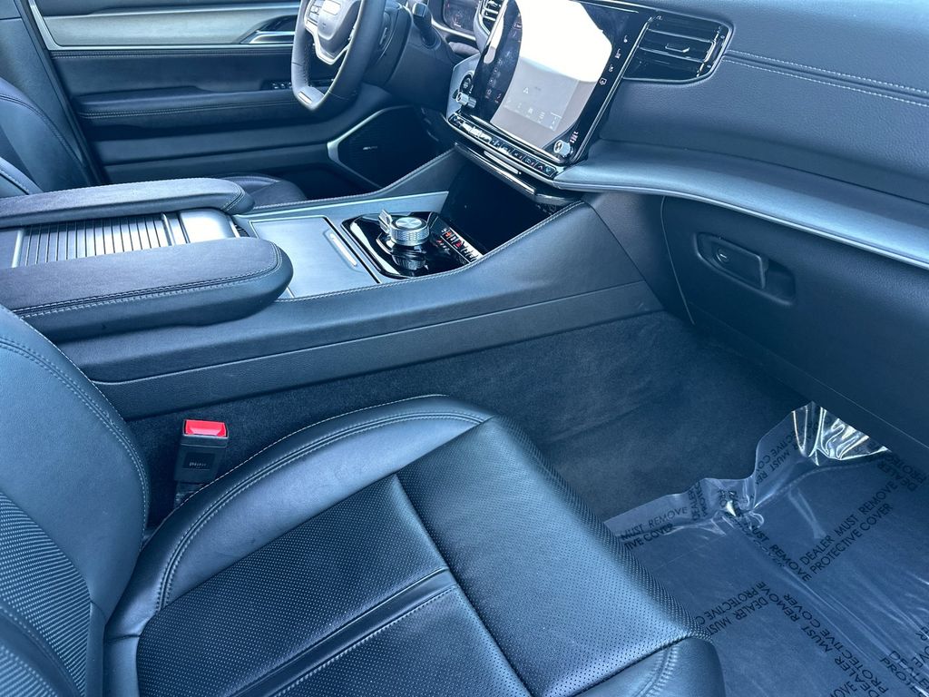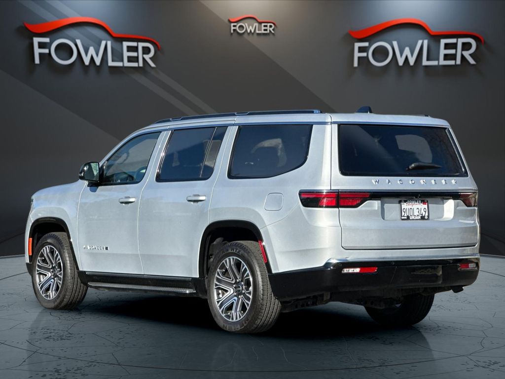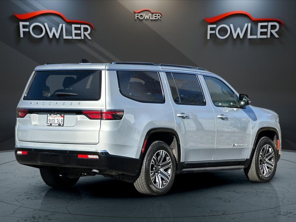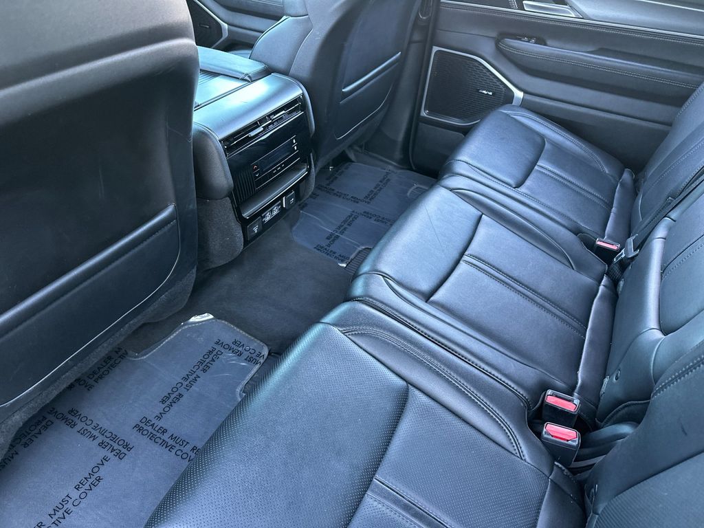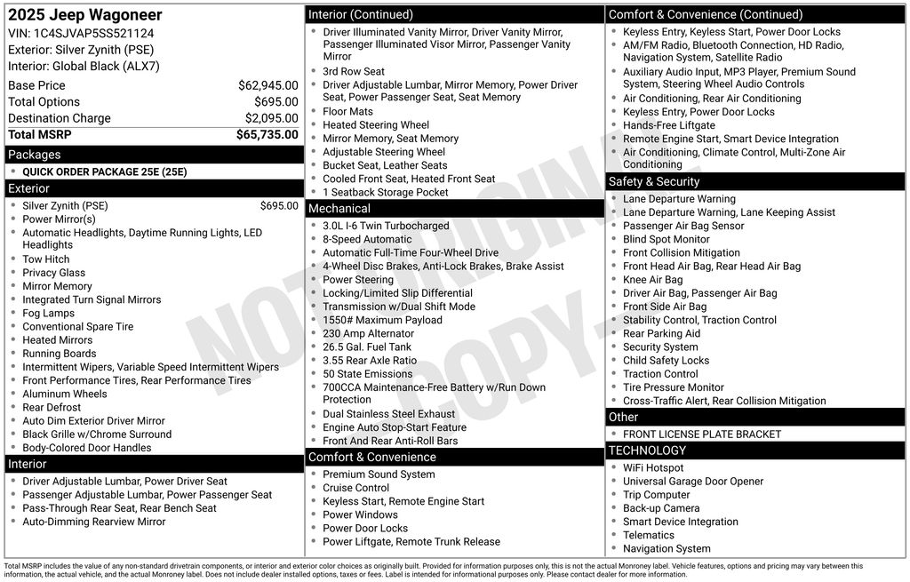 Silver Zynith 2025 Jeep Wagoneer 4WD 8-Speed Automatic 3.0L I6 10 Speakers, 3.55 Rear Axle Ratio, 3rd row seats: bench, 4-Wheel Disc Brakes, ABS brakes, Air Conditioning, Alloy wheels, AM/FM radio: SiriusXM with 360L, Anti-whiplash front head restraints, Apple CarPlay/Android Auto, Audio memory, Auto Adjust In Reverse Exterior Mirrors, Auto-dimming door mirrors, Auto-Dimming Exterior Driver Mirror, Auto-dimming Rear-View mirror, Auto-leveling suspension, Automatic temperature control, Brake assist, Bumpers: body-color, Compass, Delay-off headlights, Driver door bin, Driver vanity mirror, Driver's Seat Mounted Armrest, Dual front impact airbags, Dual front side impact airbags, Electronic Stability Control, Emergency communication system: Jeep Connect, Exterior Mirrors Approach Lamps, Exterior Mirrors w/Memory, Exterior Mirrors w/Supplemental Signals, Four wheel independent suspension, Front anti-roll bar, Front Bucket Seats, Front Center Armrest w/Storage, Front dual zone A/C, Front fog lights, Front License Plate Bracket, Front reading lights, Fully automatic headlights, Garage door transmitter, Heated door mirrors, Heated Exterior Mirrors, Heated front seats, Heated steering wheel, Illuminated entry, Knee airbag, Leather Trimmed Bucket Seats, Low tire pressure warning, Memory seat, Navigation System, Normal Duty Suspension, Occupant sensing airbag, Outside temperature display, Overhead airbag, Overhead console, Panic alarm, ParkView Rear Back-Up Camera, Passenger door bin, Passenger seat mounted armrest, Passenger vanity mirror, Power adjustable front head restraints, Power door mirrors, Power driver seat, Power Liftgate, Power passenger seat, Power steering, Power windows, Quick Order Package 25E, Radio data system, Radio: Uconnect 5 Nav w/10.1" Display, Rear air conditioning, Rear anti-roll bar, Rear dual zone A/C, Rear reading lights, Rear seat center armrest, Rear window defroster, Rear window wiper, Reclining 3rd row seat, Remote keyless entry, Security system, Speed control, Speed-sensing steering, Speed-Sensitive Wipers, Split folding rear seat, Steering wheel memory, Steering wheel mounted audio controls, Tachometer, Telescoping steering wheel, Tilt steering wheel, Traction control, Trip computer, Turn signal indicator mirrors, Variably intermittent wipers, Ventilated front seats, Voltmeter, Wheels: 20" x 9.0" Premium 2 Aluminum.