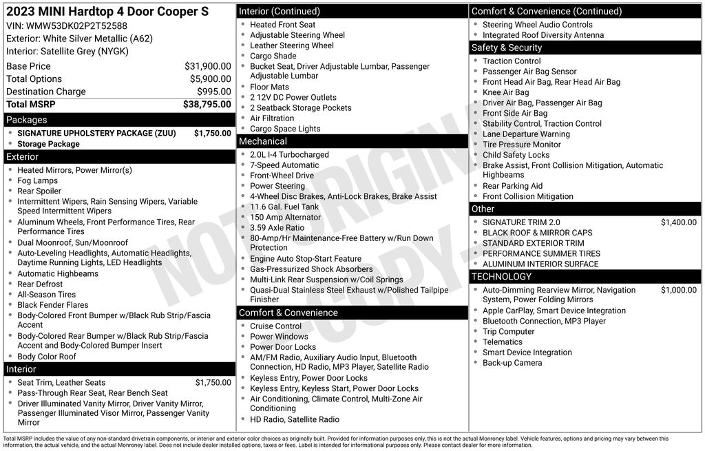 With an EPA-estimated 28 MPG in the city and 38 MPG on the highway, the 2023 MINI Cooper S Base delivers exceptional efficiency without compromising performance. Discover the perfect balance of power, style, and practicality in this remarkable MINI.