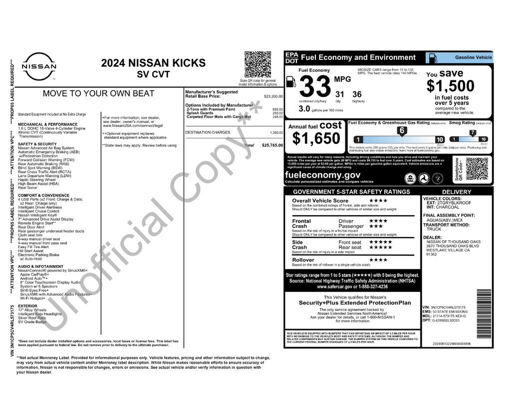 Gray/Super Black 2024 Nissan Kicks SV FWD CVT with Xtronic 1.6L 4-Cylinder DOHC 16V 3.93 Axle Ratio, 4-Wheel Disc Brakes, 6 Speakers, ABS brakes, Air Conditioning, Alloy wheels, AM/FM radio: SiriusXM, Apple CarPlay/Android Auto, Auto High-beam Headlights, Blind Spot Warning, Brake assist, Bumpers: body-color, Carpeted Floor Mats w/Cargo Mat, Cloth Seat Trim, Driver door bin, Driver vanity mirror, Dual front impact airbags, Dual front side impact airbags, Electronic Stability Control, Front anti-roll bar, Front Bucket Seats, Front Center Armrest, Front reading lights, Front wheel independent suspension, Fully automatic headlights, Heated door mirrors, Illuminated entry, Knee airbag, Low tire pressure warning, Occupant sensing airbag, Outside temperature display, Overhead airbag, Panic alarm, Passenger door bin, Passenger vanity mirror, Power door mirrors, Power steering, Power windows, Radio data system, Radio: AM/FM Audio System, Rear Parking Sensors, Rear reading lights, Rear side impact airbag, Rear window defroster, Rear window wiper, Remote keyless entry, Speed control, Splash Guards Grain (4 Piece), Split folding rear seat, Sport steering wheel, Steering wheel mounted audio controls, Tachometer, Telescoping steering wheel, Tilt steering wheel, Traction control, Trip computer, Variably intermittent wipers, Wheels: 17" Alloy (5-Hole).
