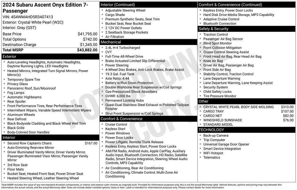 Crystal White Pearl 2024 Subaru Ascent Onyx Edition AWD Lineartronic CVT 2.4L 4-Cylinder DOHC 16V 2nd Row Captain's Chairs Rear Seatback Protector, 3rd row seats: bench, 4-Wheel Disc Brakes, 6 Speakers, ABS brakes, Air Conditioning, Alloy wheels, AM/FM radio: SiriusXM, Auto High-beam Headlights, Auto-dimming Rear-View mirror, Automatic temperature control, Axle Ratio: 4.44, Brake assist, Bumpers: body-color, Cargo Net, Cargo Tray, Compass, Crystal White Pearl Body Side Molding, Delay-off headlights, Driver door bin, Driver vanity mirror, Dual front impact airbags, Dual front side impact airbags, Electronic Stability Control, Emergency communication system: STARLINK Safety and Security (Subscription Required), Exterior Parking Camera Rear, Four wheel independent suspension, Front anti-roll bar, Front Bucket Seats, Front Center Armrest, Front dual zone A/C, Front fog lights, Front reading lights, Fully automatic headlights, Garage door transmitter: HomeLink, Heated door mirrors, Heated Front Bucket Seats, Heated front seats, Heated steering wheel, Illuminated entry, Knee airbag, Leather Shift Knob, Leather steering wheel, Low tire pressure warning, Occupant sensing airbag, Outside temperature display, Overhead airbag, Overhead console, Panic alarm, Passenger door bin, Passenger vanity mirror, Power door mirrors, Power driver seat, Power Liftgate, Power moonroof, Power steering, Power windows, Radio data system, Radio: Subaru STARLINK 11.6" Multimedia Plus System, Rear air conditioning, Rear anti-roll bar, Rear reading lights, Rear window defroster, Rear window wiper, Reclining 3rd row seat, Remote keyless entry, Security system, Speed control, Speed-sensing steering, Split folding rear seat, Spoiler, Standard Model, STARLINK/Apple CarPlay/Android Auto, StarTex Upholstery, Steering wheel mounted audio controls, Tachometer, Telescoping steering wheel, Tilt steering wheel, Traction control, Trip computer, Turn signal indicator mirrors, Variably intermittent wipers, Wheels: 20" x 7.5 J Aluminum Alloy w/Black Finish, Windshield Sunshade.