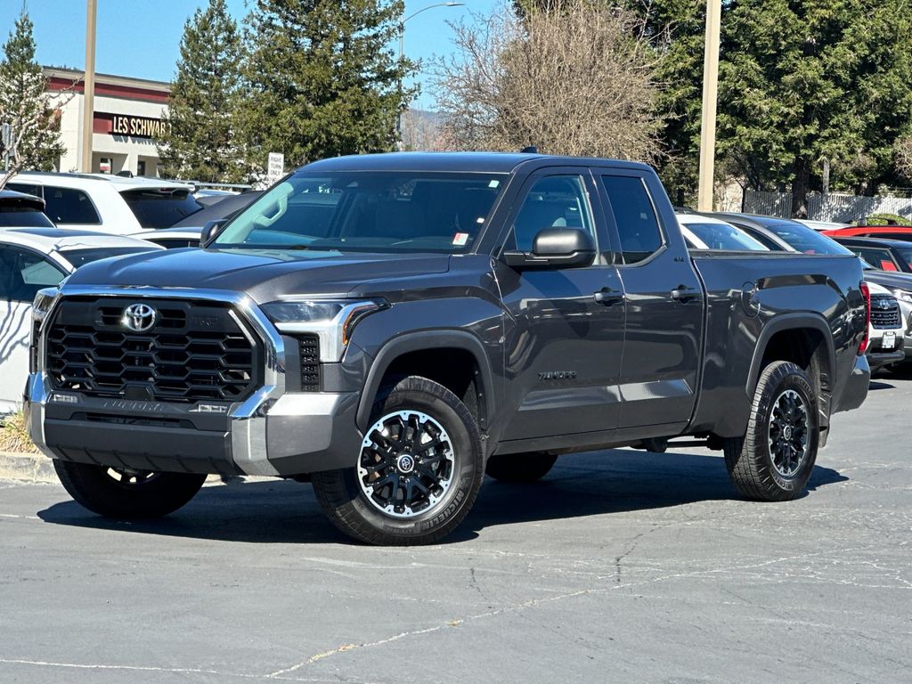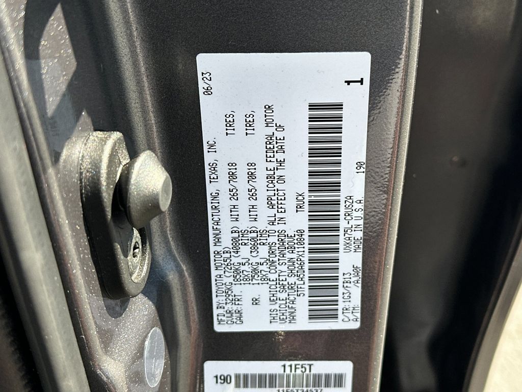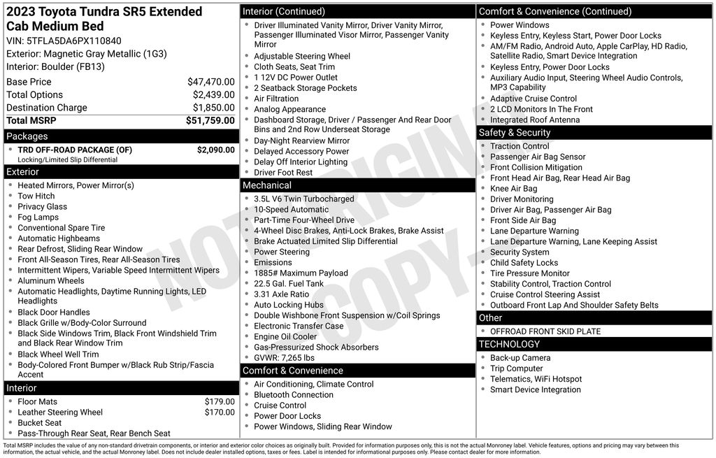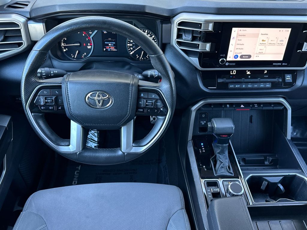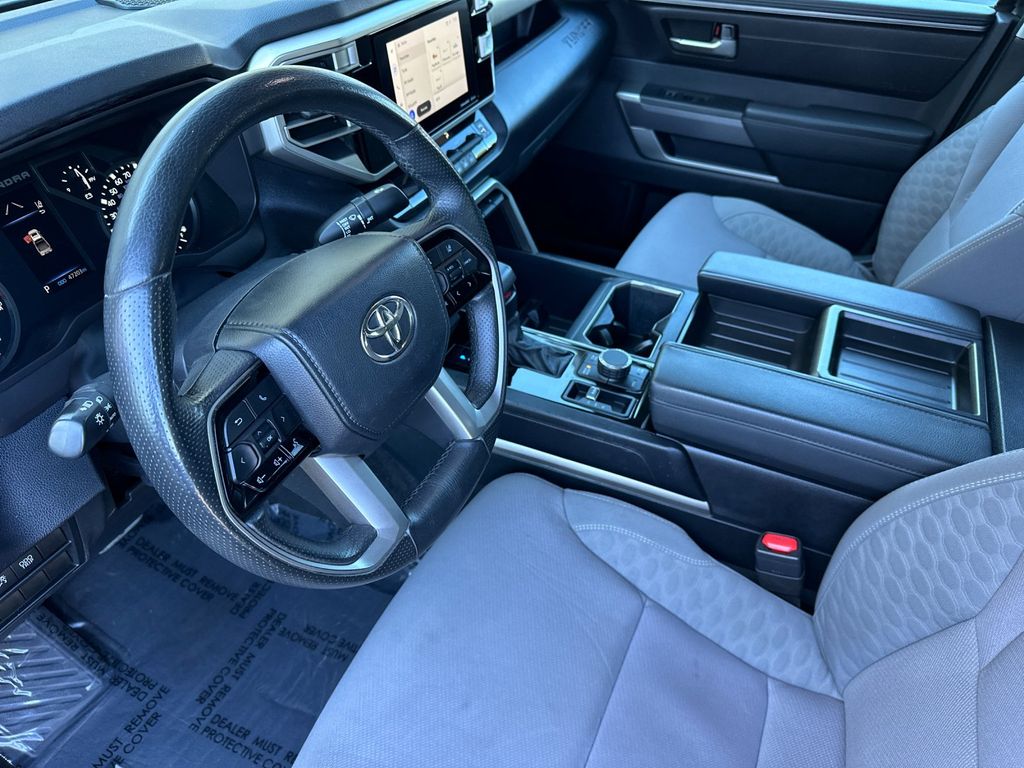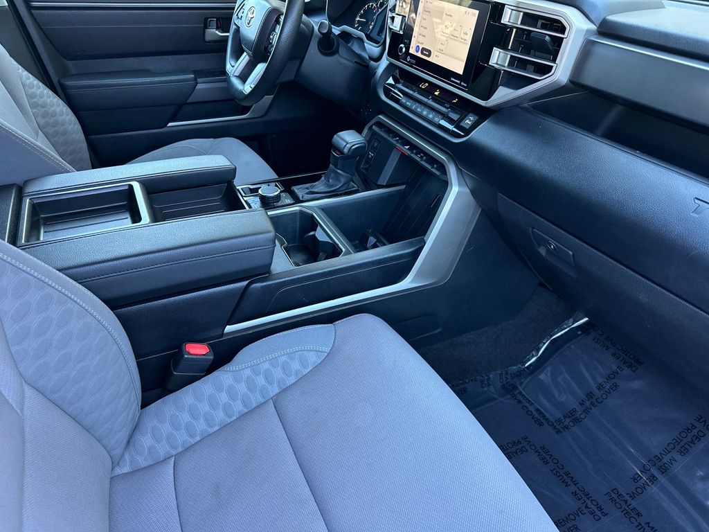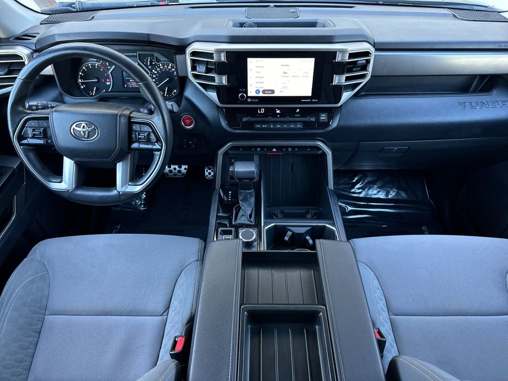 Magnetic Gray Metallic 2023 Toyota Tundra SR5 4WD 10-Speed Automatic 3.4L V6 4WD, Boulder Cloth, 18" Alloy Wheels, 3.31 Axle Ratio, 4-Way Adjustable Front Bucket Seats, 4-Wheel Disc Brakes, 6 Speakers, ABS brakes, Air Conditioning, Alloy wheels, AM/FM radio: SiriusXM, Apple CarPlay/Android Auto, Auto High-beam Headlights, Automatic temperature control, Brake assist, Bumpers: body-color, Delay-off headlights, Driver door bin, Driver vanity mirror, Dual front impact airbags, Dual front side impact airbags, Electronic Stability Control, Emergency communication system: Safety Connect (10-year trial), Exterior Parking Camera Rear, Fabric Seat Trim (FB), Front anti-roll bar, Front Bucket Seats, Front Center Armrest, Front fog lights, Front reading lights, Front wheel independent suspension, Fully automatic headlights, Heated door mirrors, Illuminated entry, Knee airbag, Low tire pressure warning, Occupant sensing airbag, Outside temperature display, Overhead airbag, Overhead console, Panic alarm, Passenger door bin, Passenger vanity mirror, Power door mirrors, Power steering, Power windows, Radio data system, Radio: Audio Multimedia System, Rear reading lights, Rear step bumper, Rear window defroster, Remote keyless entry, Safety Connect, Security system, Speed control, Speed-sensing steering, Split folding rear seat, Steering wheel mounted audio controls, Tachometer, Telescoping steering wheel, Tilt steering wheel, Traction control, Trip computer, Variably intermittent wipers, Voltmeter, 4WD, Boulder Cloth.